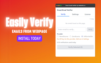 Smart Email Verifier, Chrome tarayıcısı için tasarlanmış bir e-posta doğrulama uzantısıdır. Kullanıcıların herhangi bir web sayfasındaki e-posta adreslerini hızlı ve etkili bir şekilde doğrulamalarına olanak tanır. Üç farklı sağlayıcıdan (NeverBounce, ZeroBounce, MillionVerifier) gerçek zamanlı doğrulama sonuçları alarak, kullanıcıların iş akışlarını kesintiye uğratmadan e-posta adreslerini kontrol etmelerine yardımcı olur. Uzantı, tekil veya toplu doğrulama seçenekleri sunarak verimliliği artırır.